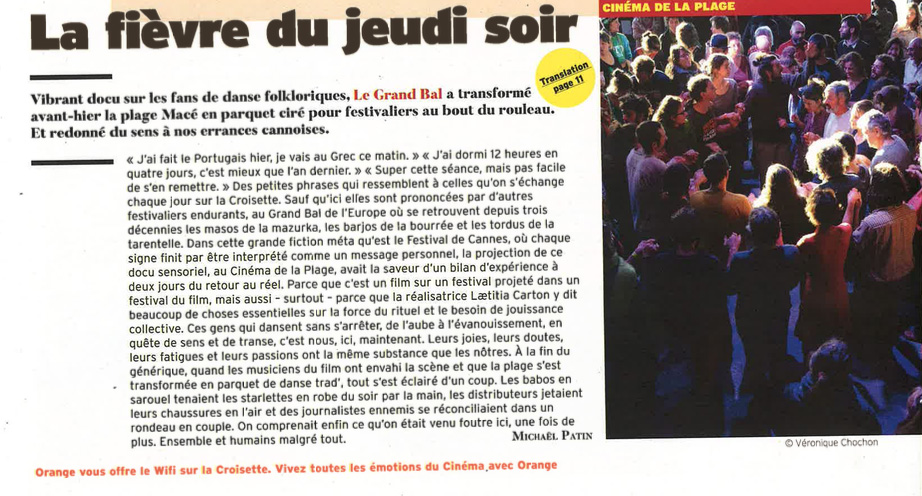 Vibrant docu sur les fans de danse folkloriques, le grand bal a transformé avant-hier la plage Macé en parquet ciré pour festivaliers au bout du rouleau, et redonné du sens à nos errances cannoises.
