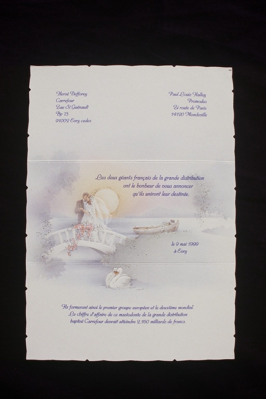 Puis j’ai réalisé une série de faire-part de mariage pour célébrer les unions des fusons d’entreprises. A l’époque j’avais conscience que c’était elles qui dessinaient déjà le monde dans lequel on allait vivre.