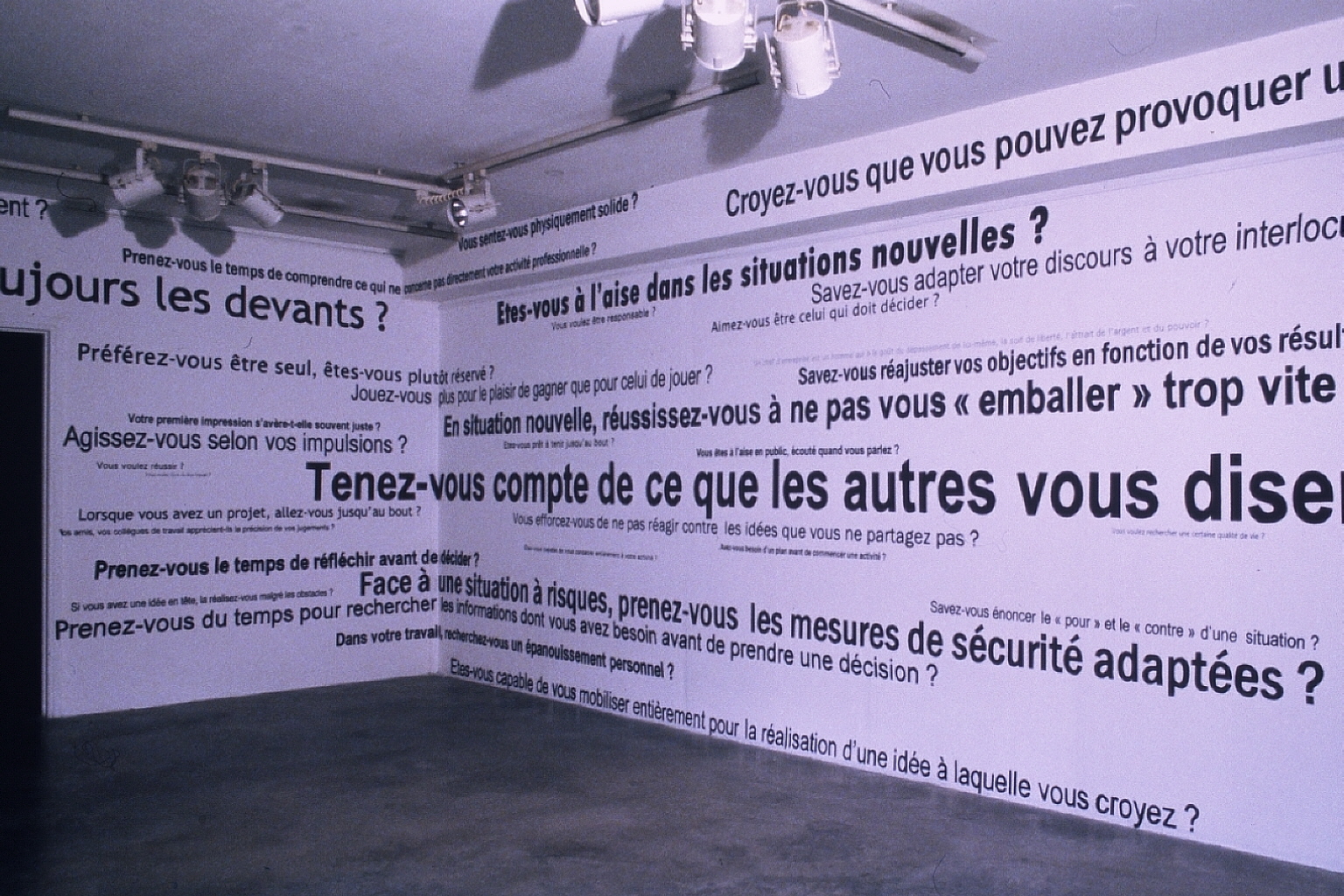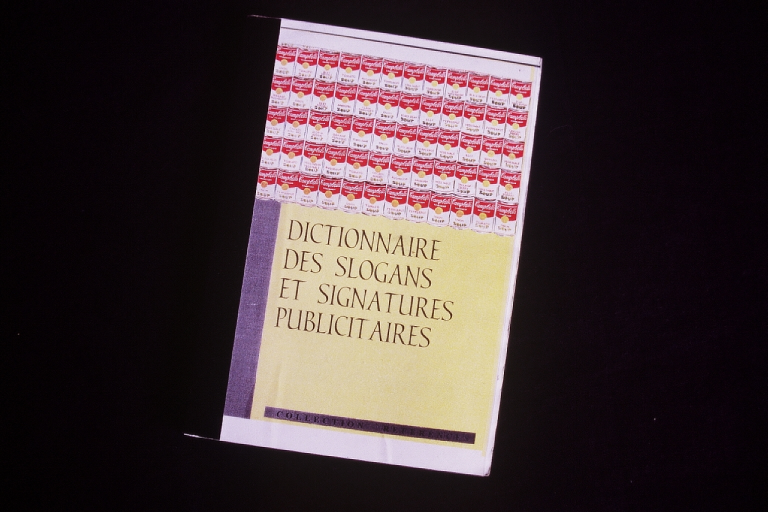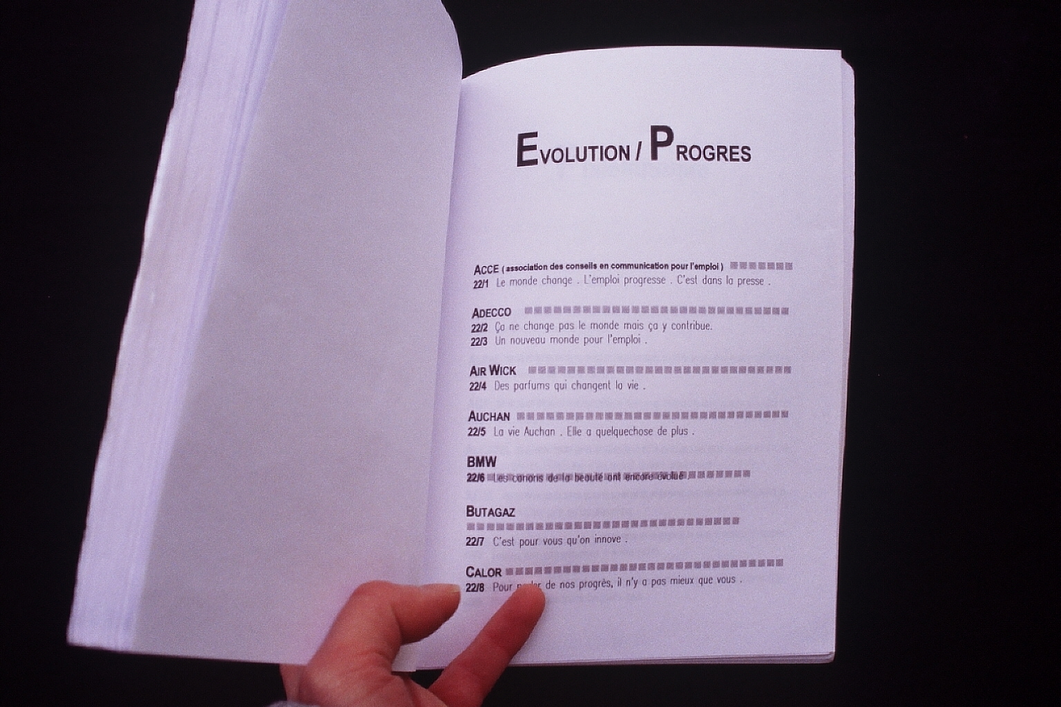 J’ai commencé aussi à collecter tous les slogans publicitaires que je voyais ou entendais. Cela a pris la forme d’un dictionnaire, avec des entrées par valeurs véhiculées mais c’était aussi une matière première pour de nombreuses installation in-situ, et environnements dans le futur.